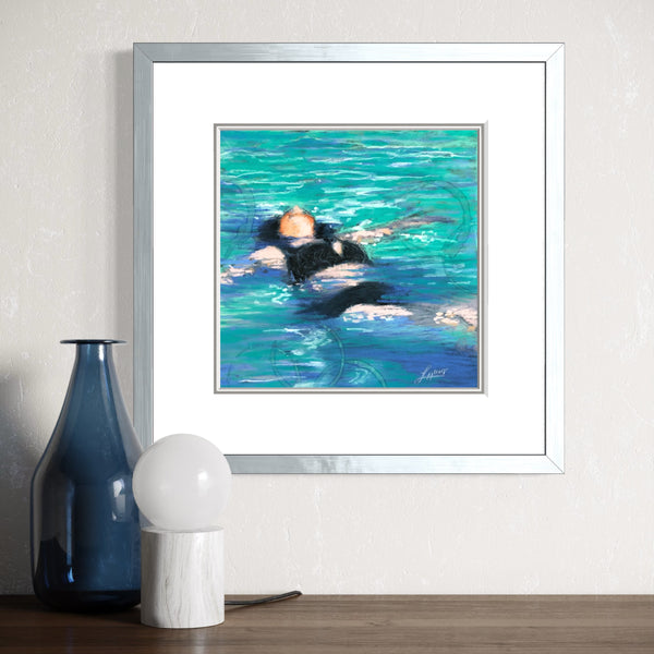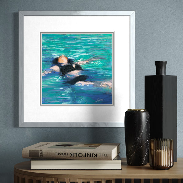Given the phrases "liminal spaces" as a painting prompt, I allow the idea to brew in the back of my mind until one day I come across images of my grandchildren at the pool. The water appears to break up the body, causing an abstraction than can occur no other way. Several studies later, I complete this, with teenage grandchild poised between weightlessness and gravity, between childhood and adulthood. It becomes my response to the prompt.